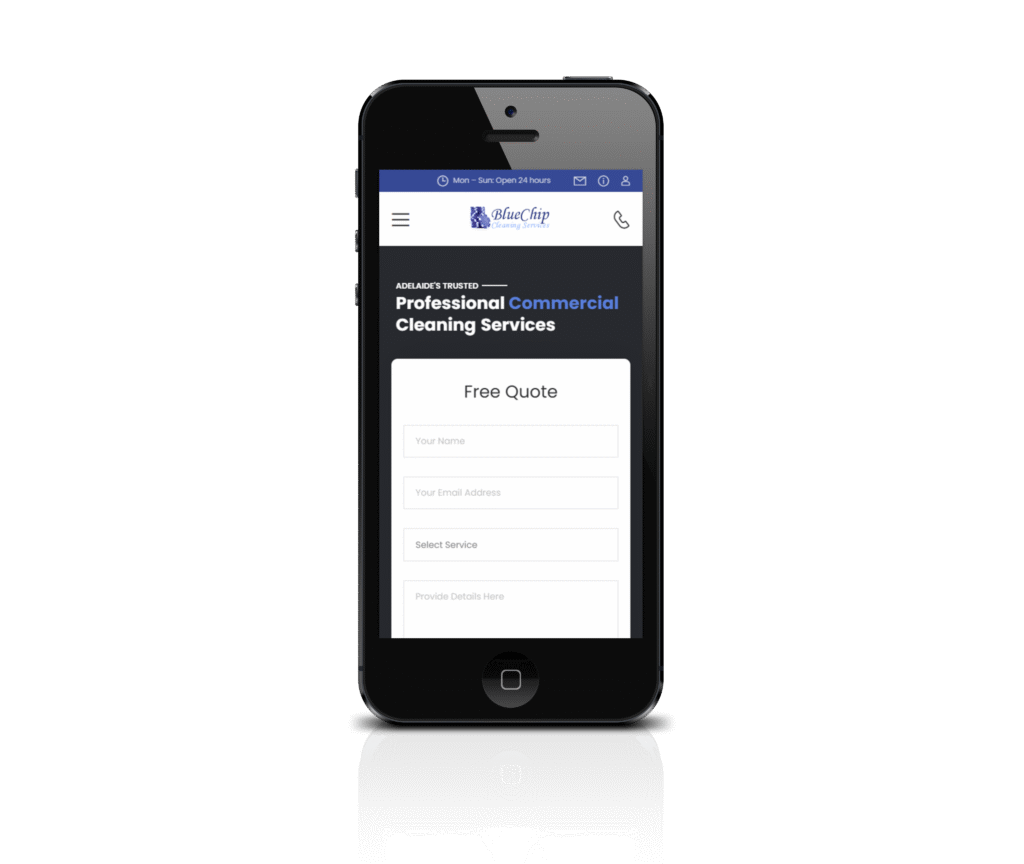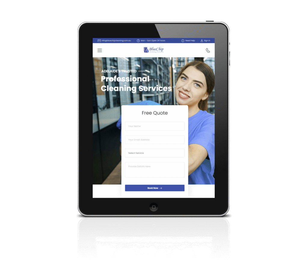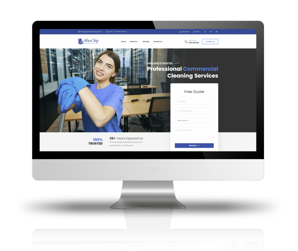 The website design for Blue Chip Cleaning Services, reflects a professional and straightforward approach that emphasises service reliability and customer satisfaction. The homepage features a clean, white background with blue accents, aligning with the company’s name and logo, which helps establish a brand identity associated with trust and cleanliness.